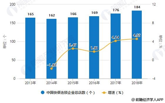 2013-2018年,中国快餐连锁企业的总店数整体呈增长趋势,总店数从2013年的165个增长到2018年的184个。