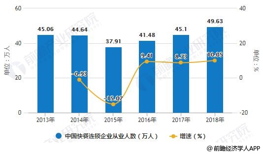 2013-2018年中国快餐连锁企业从业人数统计及增长情况