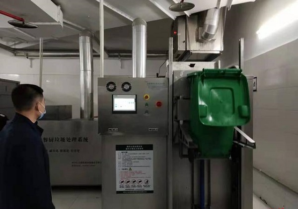 在成都高新区管委会集中办公区负一楼,记者见到了成都高新区管委会集中办公区使用的智能餐厨垃圾处理系统,集中办公区食堂每天产生的400公斤餐厨垃圾都会被运往该处进行“就地处理”。