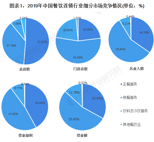 2019年,正餐连锁企业在总店数上远超过快餐连锁企业、饮料及冷饮服务连锁企业和其他餐饮连锁企业,而在门店总数、从业人数、餐饮营业面积、餐位数和营业额上,快餐连锁企业要更加领先。