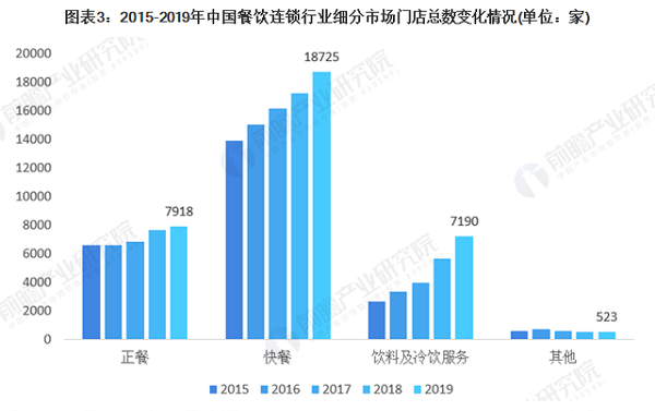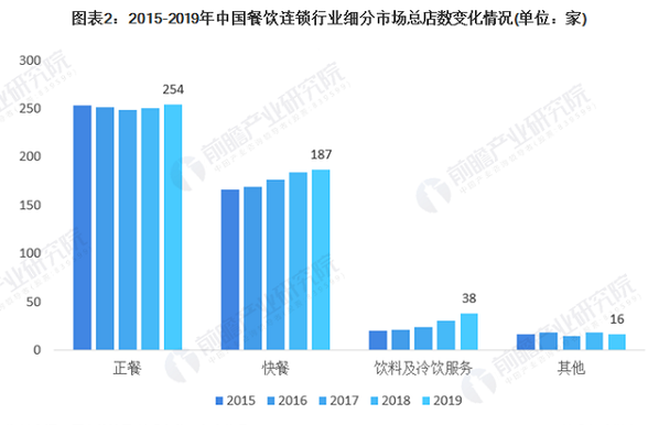 从总店数量变化趋势上看,快餐、饮料及冷饮服务连锁企业总店数量整体呈上升趋势,正餐连锁企业总店数量波动变化,其他类餐饮连锁市场总店数量整体下降。在几个细分市场中,正餐连锁企业总店数量较多,快餐连锁企业位居第二,但近年来快餐连锁企业总店数量一直稳定上升。2019年,正餐、快餐、饮料及冷饮服务连锁企业总店数量分别为254家、187家、38家。