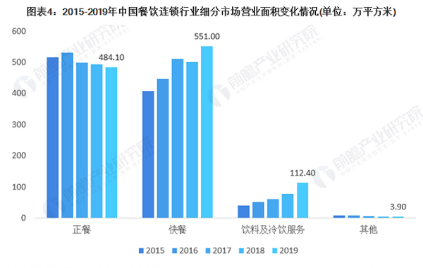 2015-2019年,正餐连锁企业营业面积整体呈下降趋势,快餐连锁企业营业面积整体上升,2017年,快餐连锁企业营业面积首次超过正餐连锁企业,并在之后几年一直领先;2019年,快餐连锁企业营业面积达551万平方米。