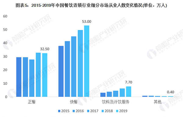 2015-2019年,快餐连锁企业从业人数稳居第一,且一直处于稳定增长态势,2019年,快餐连锁企业从业人数达53万人;正餐连锁企业从业人数波动变化。在结合门店数量情况看,2019年,快餐连锁企业平均单店从业人数达28人,正餐连锁企业为41人,可见,正餐连锁企业单家门店创造的就业岗位仍要高于快餐企业,在缓解就业压力方面具有重要作用。