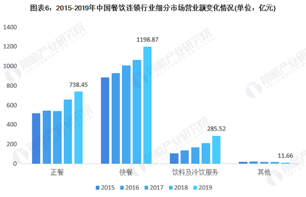 我国餐饮连锁细分市场包括正餐连锁、快餐连锁、饮料及冷饮服务连锁和其他餐饮连锁市场。我国的快餐连锁业起步较晚,经过多年的发展,快餐连锁业快速增长,快餐业态已经成为我国餐饮市场上营业额超越正餐的业态,市场份额不断扩大,已占据餐饮连锁市场50%以上份额,发展优势明显。
