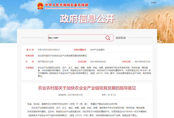 2021年5月26日,农业农村部《关于加快农业全产业链培育发展的指导意见》强调,创新发展农商直供、预制菜肴、餐饮外卖、冷链配送等业态,开发推广“原料基地+中央厨房+物流配送”等模式。