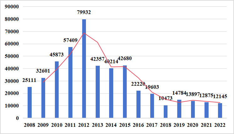 2008-2022年间发生的问题食品数量的时序分布 (单位:起)