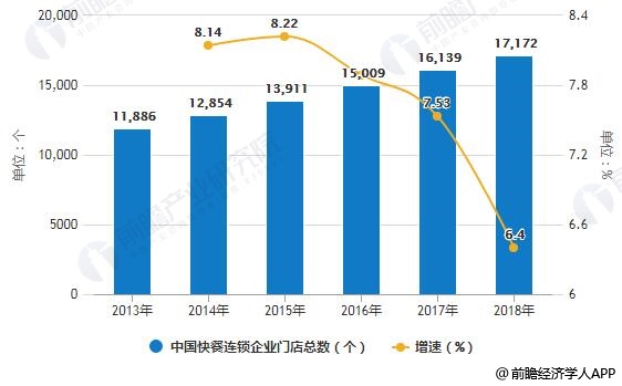 2013-2018年中国快餐连锁企业门店总数统计及增长情况