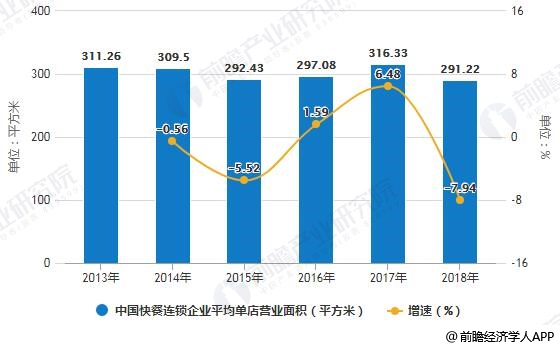 2013-2018年,中国快餐连锁企业平均单店营业面积(年末餐厅营业面积/门店总数)呈波动下降趋势。2017年达到最大值,为316.33平方米,同比增长6.48%。2018年,营业面积为291.22平方米,同比下降7.94%,为近年来最大降幅。