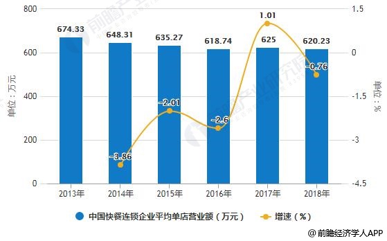 2013-2018年,中国快餐连锁企业平均单店营业额(营业额/门店总数)整体呈下降趋势,从2013年的674.33万元下降至2018年的620.23万元。
