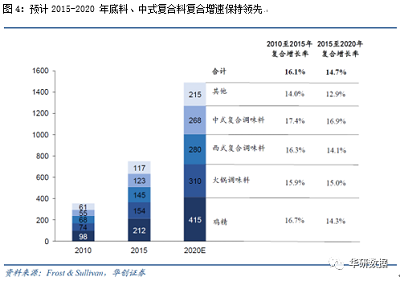 火锅调味料是复合调味料的第二大子品类,包括火锅底料(占80%)和火锅蘸料(占20%)。根据Frost & Sullivan 的数据,2018 年火锅调味料的市场规模为237 亿元(火锅底料194 亿元,火锅蘸料43 亿元),预计到2020 年火锅调味料的市场规模将达到310 亿元(其中火锅底料255 亿元,火锅蘸料55 亿元),复合增长率达15%。