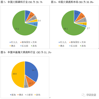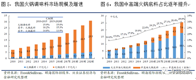 根据 Frost& Sullivan,2015年,我国火锅调味料行业CR5为29.7%,其中火锅底料市场CR3为24.1%,CR5为30.9%,集中度偏低;而中高端火锅底料的CR3为51.1%,远高于整体集中度。