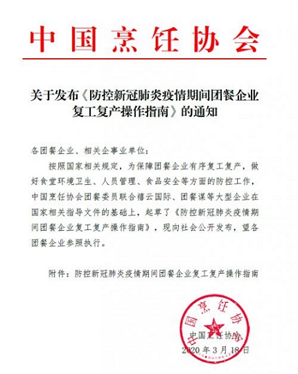 随着全国复工复产工作的逐步推进,为复工单位提供饮食后勤保障的团餐企业也加速了复工进度。为保障团餐企业有序复工复产,中国烹饪协会日前联合中国团餐产业链一站式企业服务平台禧云国际、中国首席团餐经营新媒体团餐谋,起草了《防控新冠肺炎疫情期间团餐企业复工复产操作指南》(下称《指南》)。
