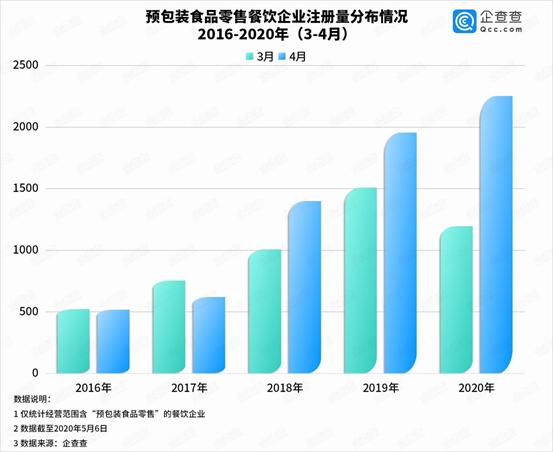 于是,餐饮企业将目光转移到“预包装食品”身上,国内经营范围含“预包装食品零售”的现存餐饮企业近6万家,企查查数据显示,2020年4月,相关餐饮企业注册量突破2000家,环比今年3月,增长88.29%,同比2019年4月,增长15.2%。