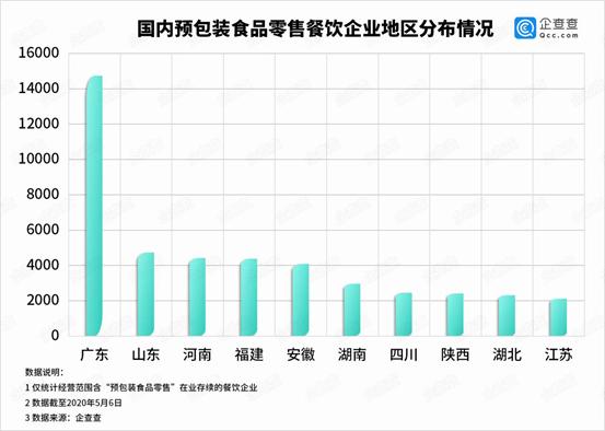 从地域上来看,从事预包装食品零售的餐饮企业主要集中在东部沿海地区,据新华网和中国饭店协会联合发布的《2019年中国餐饮业年度报告》显示,山东、广东、江苏、河南、四川等地,其餐饮收入均名列前茅。而这些省份,也恰巧是预包装食品零售企业集中分布的地方,据企查查数据显示,广东省拥有相关企业数量最多,数量突破1.4万家,是山东省的3.12倍。