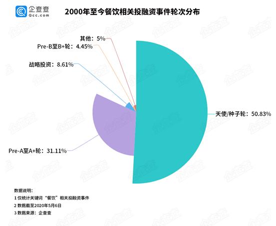 从餐饮行业融资信息来看,企查查数据显示,从2000年至今有关餐饮相关的投融资事件共350余件。其融资轮次主要集中在天使轮和Pre-A至A+轮,各占总量的50.83%和31.11%。