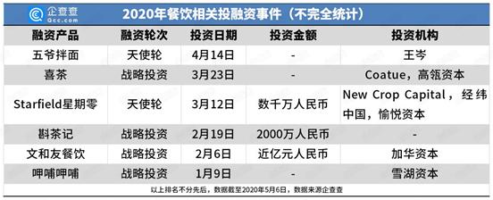 截至2020年5月6日,企查查数据显示,有关餐饮的投融资事件已超5件,主要集中在战略投资,范围从饮品、美食,再到人造肉。就公开融资金额来看均在千万级别以上。