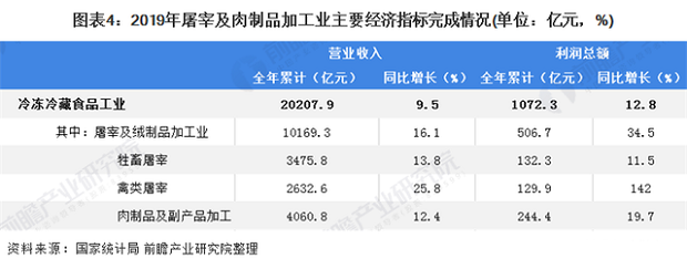 据国家统计局数据,2019年全国规模以上屠宰及肉制品加工企业3503家,共计完成营业收入10169.3亿元,同比增长16.1%,其中:牲畜屠宰、禽类屠宰、肉制品及副产品加工业完成营业收入同比分别增长13.8%、25.8%、12.4%。生产冷鲜、冷藏肉2817.5万吨,同比增长0.9%。2019年全行业实现利润506.7亿元,同比增长34.5%。其中:牲畜屠宰、禽类屠宰、肉制品及副产品加工业实现利润同比分别增长11.5%、142.0%、19.7%。