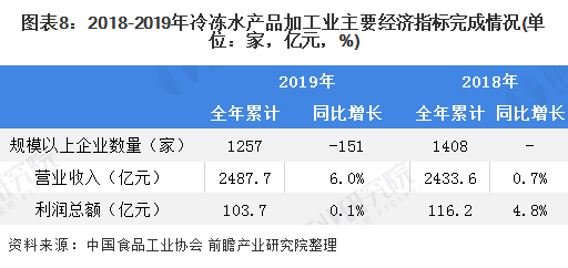 2019年规模以上冷冻水产品加工企业1257家,同比下降151家。累计完成营业收入2487.7亿元,同比增长6.0%,实现利润总额103.7亿元,同比增长0.1%。生产冷冻水产品739.2万吨,同比增长3.7%。