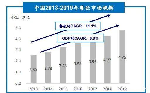 2019年中国餐饮消费市场整体在4.7万亿左右,过去六年复合增长率为11.1%,预计2024年市场规模有望达7.16万亿元。持续增长的餐饮消费市场表明需求及供给两侧存在众多发展机会。