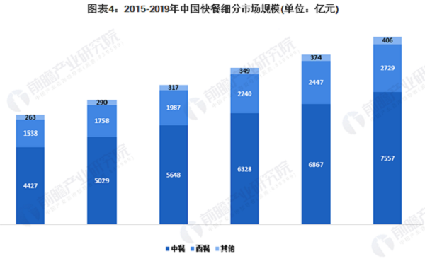 快餐细分市场是中国餐饮业中增长最快的餐厅服务类型之一,有巨大的发展空间。2019年,中国每一百万人中仅有约503间快餐餐厅,而美国则有约1,035间。随着快餐细分市场迅速增长,其在中国整体餐饮业的占比不断增加,由2014年的约21.5%增加至2019年的约22.9%,。受城市化水平提高及消费者对食品安全及快速方便的快餐的需求增加所带动,快餐细分市场由2014年的人民币6228亿元增至2019年的人民币10692亿元。2019年,西餐占中国快餐市场规模的25.5%,而中餐则占70.7%。