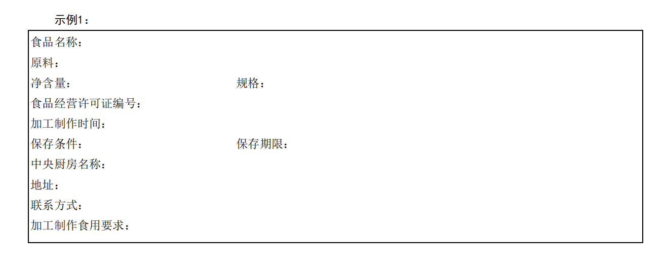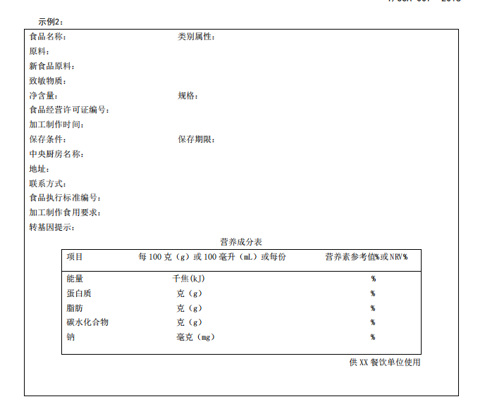 本标准适用于取得食品经营许可证的中央厨房提供给餐饮业再加工使用的食品标签。