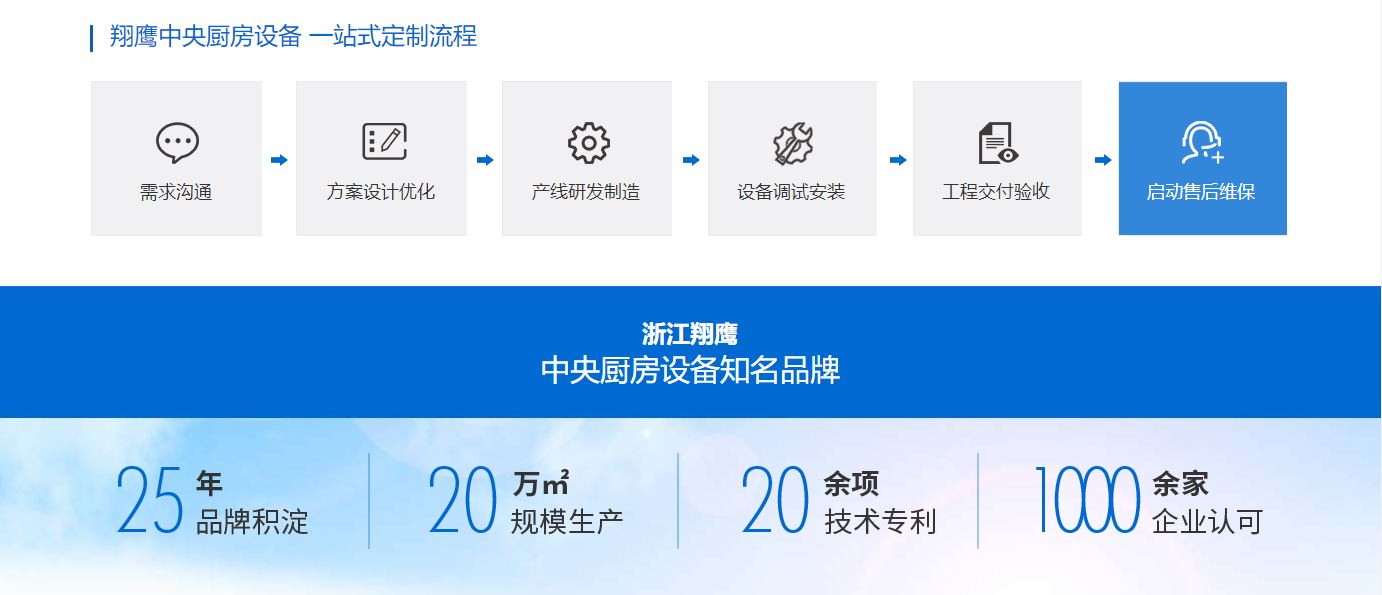浙江翔鹰中央厨房设备公司是专业从事大型供餐中心、食品工厂、企事业单位、高等院校食堂、社会集团供餐、高中档酒(饭) 店等中央厨房设备的策划、设计、制造及安装工程的厂家。公司现拥有中央厨房的自动米饭生产线系列; 大型智能蒸箱、醒发箱系列; 智能炒菜机系列; 洗碗机系列; 炒(汤)锅系列; 消毒柜系列; 油炸机系列; 洗菜机(线) 系列; 食品运输机系列; 餐具清洗消毒线系列; 炉具、冷藏、冷冻、蒸煮、台柜、洗涮、自动化食品加工机械; 抽油烟机等十八大系列近2000多个规格品种的研发生产能力,并代理国外名牌食品加工机械及西餐厨房设备,是目前我国大型中央厨房设备生产企业之一。