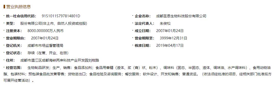 2007年成都圣恩生物科技股份有限公司,在国家级开发区成都温江区海峡两岸科技产业开发园正式成立。圣恩股份将“S-安全”“N-天然”“S-美味”作为企业的品牌信仰,秉持“为每一个人带来健康美味的享受”的企业愿景,在咸味香精和调味品领域展开深入研究,挖掘中华美食的经典味道,实现味道的标准化,将个性化定制的美味与现代食品工业、餐饮行业完美结合,传播美味。