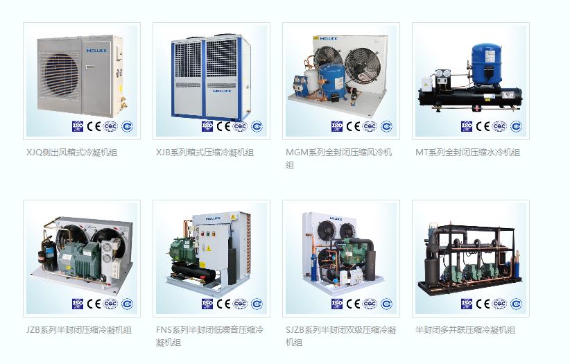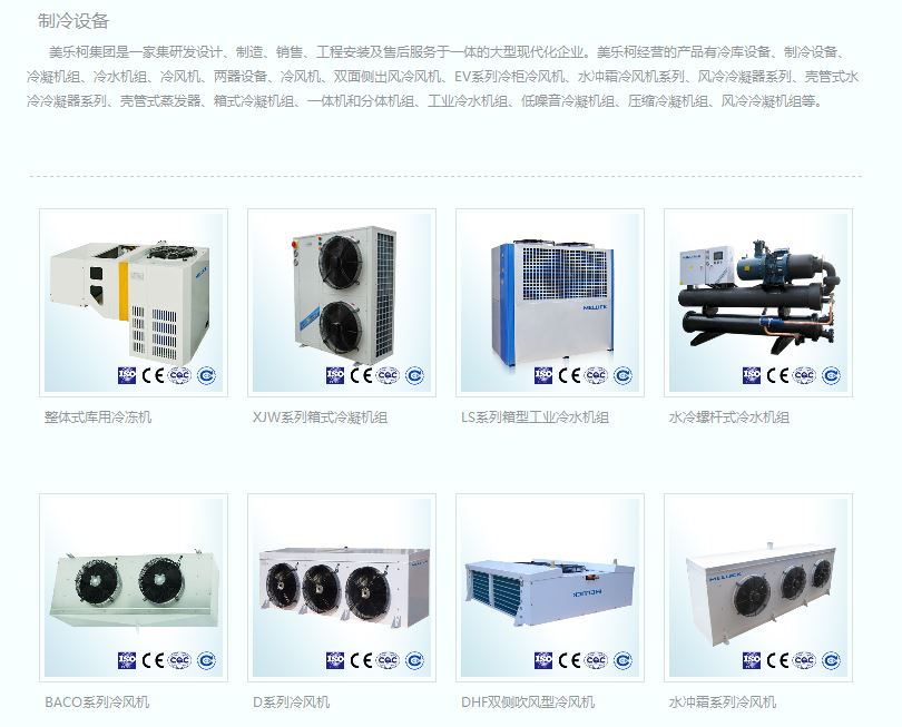 作为国内 大的制冷设备供应商之一,美乐柯不断引进 尖端的制冷技术,并根据广大用户的需求,自行研发制造出10多款系列产品:MAC系列、FD系列、D系列冷风机、DHF系列双面侧出风冷风机、EV系列冷柜冷风机、水冲霜冷风机系列、风冷冷凝器系列、壳管式水冷冷凝器系列、壳管式蒸发器、箱式冷凝机组、一体机和分体机组、汉钟螺杆机组、敞开式机组、并联机组、工业冷水机组、低噪音冷凝机组、压缩冷凝机组、风冷冷凝机组等,所有机组均采用比泽尔、谷轮、美优乐等 著名品牌压缩机,具有性能优,外形美观的特点,广泛应用于食品冷冻冷藏、酒店冷库、工业工艺冷却、医疗冷库、冷藏车、船用冷库等领域,得到了用户的高度评价。同时,产品还远销中东、欧洲、澳洲、东南亚、非洲等几十个国家和地区,为不同需求的用户提供了全套的生产设备与解决方案。