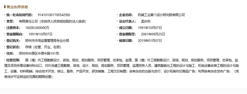 机械工业第六设计研究院有限公司(以下简称中机六院)创建于1951年,是拥有工程设计综合甲级资质的国家大型综合设计研究院,隶属世界500强企业、中央大型企业集团——中国机械工业集团有限公司。