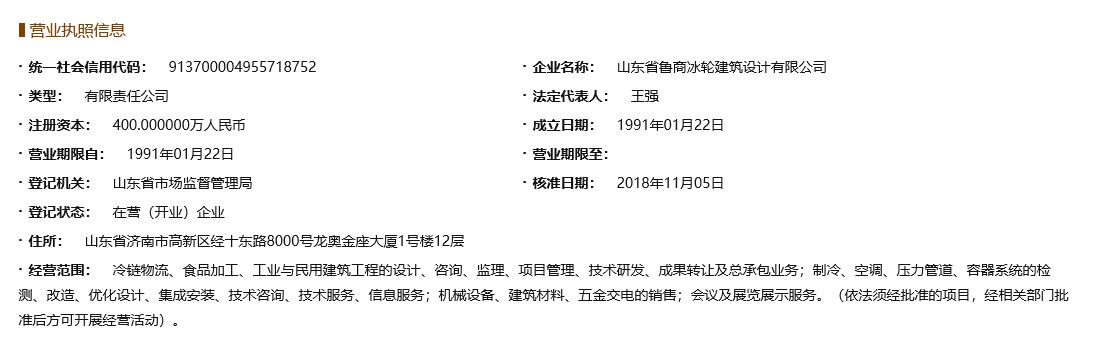 山东省鲁商冰轮建筑设计有限公司(原山东省商业工程设计院)成立于1976年,位于美丽的泉城济南,是一家以商业工程设计为主的现代化高新技术企业。公司具有国家建设部颁发的商物粮行业(冷冻冷藏、食品加工)专业甲级、建筑(建筑工程)甲级设计资质及压力管道设计资质,业绩遍布全国各地。