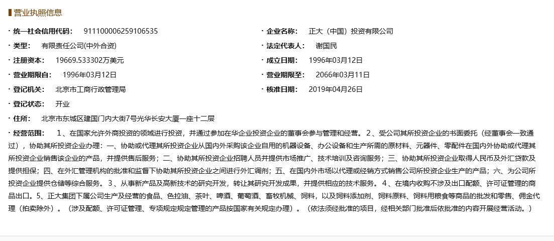 作为中国改革开放后第一家在华投资的外商企业,40年来,正大集团秉承“利国、利民、利企业”的经营宗旨,积极投身中国改革开放事业,并不断加大在华投资力度。截至目前,正大集团在中国设立企业超过400家,下属企业遍及除西藏以外的所有省份,员工超8万人,总投资超1200亿元,年销售额近1200亿元。拥有正大饲料、正大食品、正大鸡蛋、正大种子、卜蜂莲花、大阳摩托、正大广场、正大制药、《正大综艺》等具有广泛知名度的企业、品牌和产品。正大集团已成为在华投资规模最大、投资项目最多的外商投资企业之一。