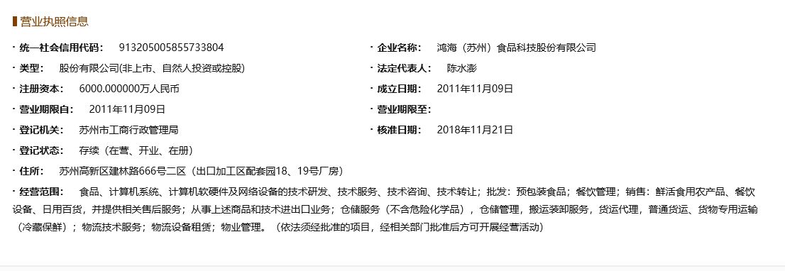 鸿海(苏州)食品科技股份有限公司(简称鸿海食品)成立于2011年,公司以中餐标准食材供应链运营为经营方式,借助大物流、大仓储、全线产品一站式配送、引领餐饮行业标准化。在坚持核心业务的基础上对研发、品控、信息技术进行深挖,为客户创造更多价值,助力行业整体升级!