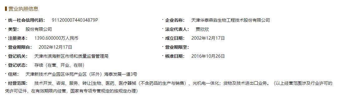 天津华泰森淼生物工程技术股份有限公司成立于2002年12月17日,为内资企业(股份有限责任公司),注册地址在天津市华苑产业区(环外)海泰发展一道3号,注册资金为1390.6万元人民币,经营范围主要为技术开发、咨询、服务、转让【生物、医药、医疗器械(不含药品的生产与销售)、光机电一体化】;货物及技术进出口业务。