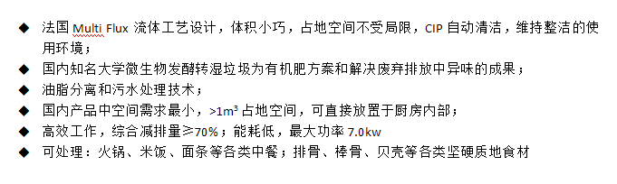 Multi Flux油脂分离和湿垃圾处理一体机经过实地调研和测试,孕育而生。它为您有效减少湿垃圾处置费用,提升您的后厨品质,提供安全的操作环境。