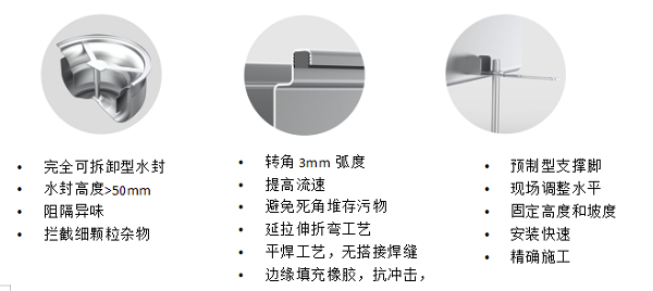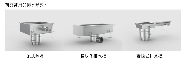 1、 厨房内开放式排水槽,带格栅盖板,排水槽为V型坡底,内部自带5%坡度