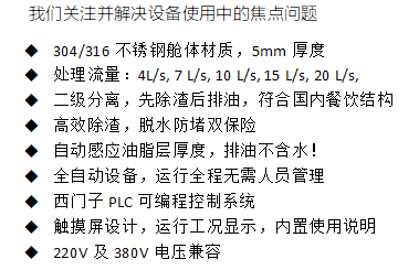 1、 油脂分离器,有效容积0.4m3,处理量2L/s; 2、 干湿分离,传送装置,可分离出厨余干垃圾,湿垃圾和液体 3、 油脂观察窗,透明材质带洁净刮板