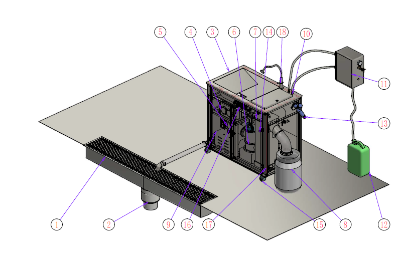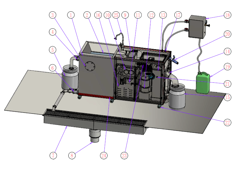 4、 排油阀门 5、 25L油脂收集桶,带透明密封桶盖,用一配一 6、 排空阀门,每天清理打开 7、 厨房内开放式排水槽,带格栅盖板,排水槽为V型坡底,内部自带5%坡度